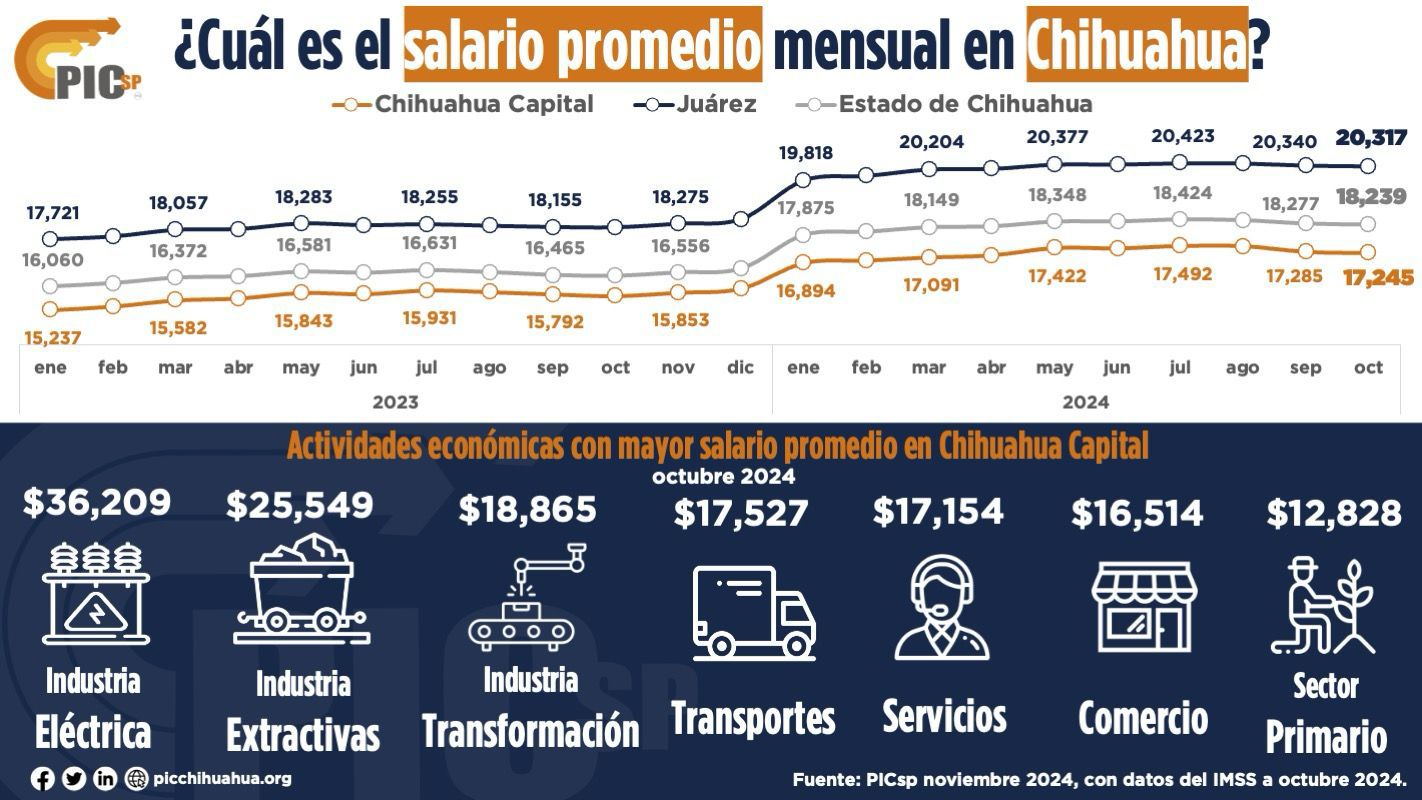 El salario promedio en la entidad es de 20 mil 317 pesos al mes, mientras que en Ciudad Juárez es de 18 mil 239 y en la capital del estado de 17 mil 245 pesos.