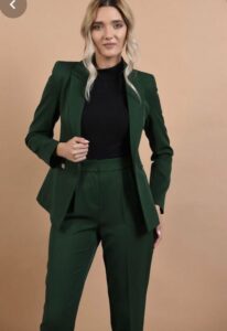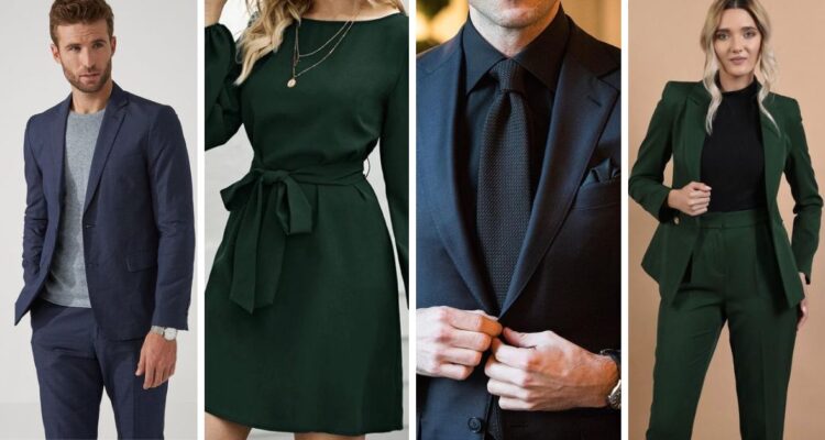 Las mujeres pueden optar por trajes pantalón con blusas elegantes o vestidos midi, en colores como borgoña o verde profundo.