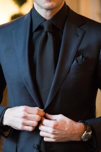 Para los hombres, trajes oscuros en negro o azul marino con camisas en tonos complementarios, son opciones infalibles. Completa el look con joyería minimalista.