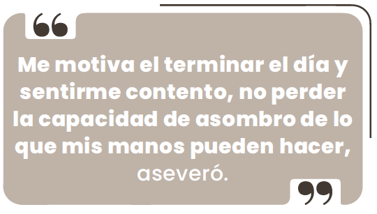 Salgado refirió que por años su meta has sido el ser más eficiente, expandir su capacidad de observación, así como de entendimiento de la forma, técnica y materiales. “Me motiva el terminar el día y, después de tantos años, sentirme contento y no perder la capacidad de asombro de lo que mis manos pueden hacer”, confesó.