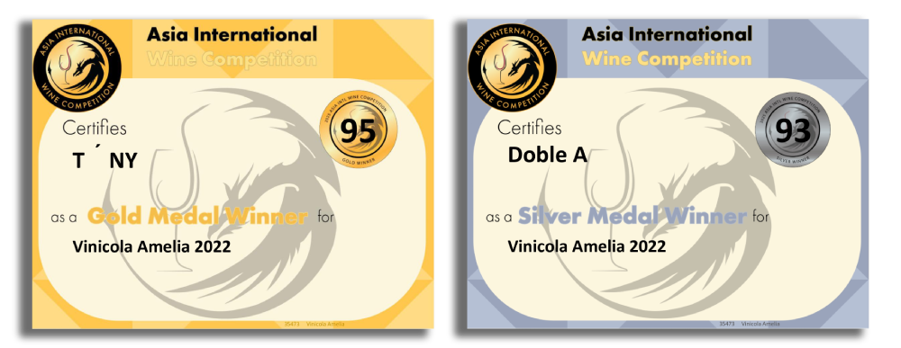Las etiquetas de Vinícola Amelia, T’NY Chardonnay 2022 y Doble A 2022 fueron galardonadas con Oro y Plata